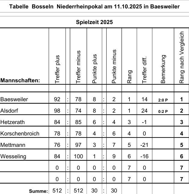 Beim Heimturnier im Rahmen des Niederrheinpokals setzten sich unsere 3 Bosselspieler/innen Maritta Leiser, Helmut Sauerborn und Frank Reimann sehr erfolgreich durch. Die Baesweiler gewannen das Turnier mit 6 teilnehmenden Mannschaften knapp. Letztendlich entschied das direkt gewonnenen Spiel gegen Alsdorf. Herzlichen Glückwunsch an das Baesweiler Team, das in der Gesamtwertung des Niederrheinpokals auf dem 2. Platz liegt.
